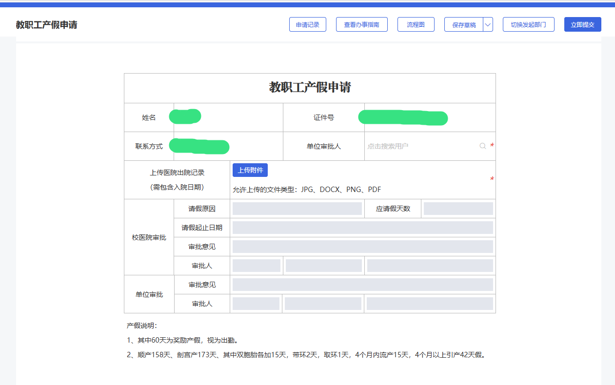 (1)流程开始,表单自动加载申请人姓名、证件号、联系方式。
