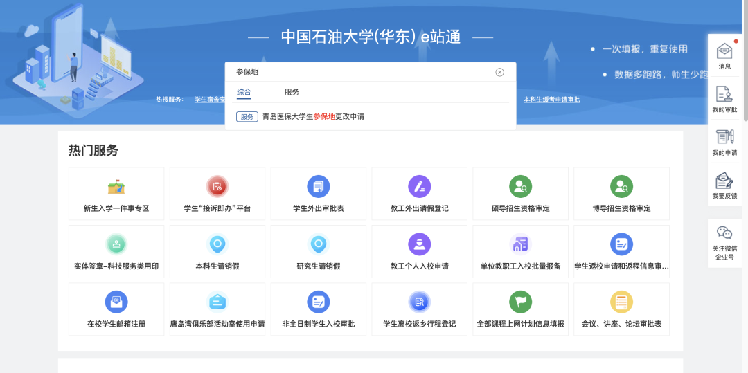 ·于中国石油大学(华东)e站通搜索青岛医保大学生参保地更改申请